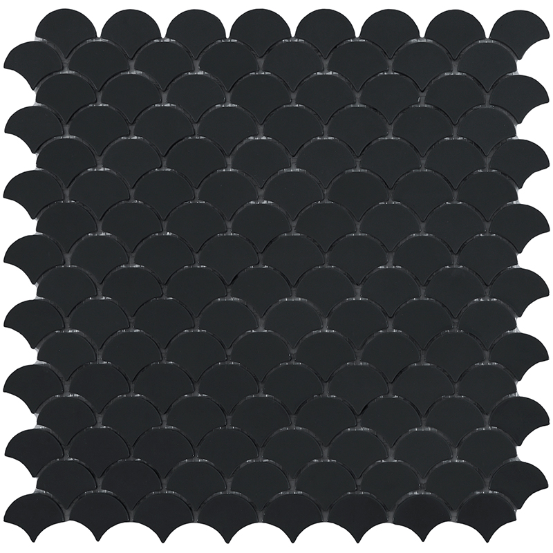 Skleněná mozaika černá FTNOR6108 s matným povrchem a ve tvaru rybích šupin jednotlivých prvků mozaiky.