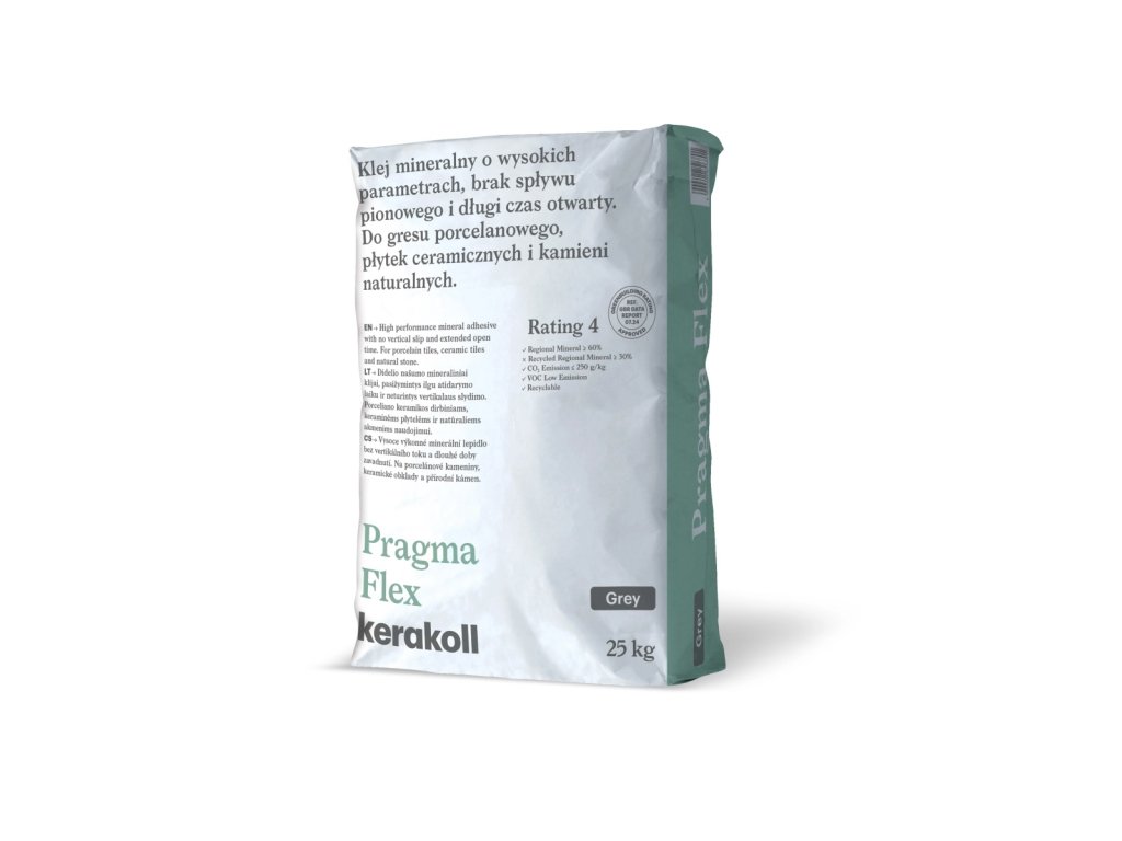 Pragma Flex je vysoce výkonné minerální lepidlo pro lepení mozaiky, keramických obkladů, dlažby, porcelánové kameniny a přírodního kamene v interiéru i exteriéru. Je navrženo jako cenově efektivní řešení pro velké stavební projekty, přičemž si zachovává vysokou přídržnost (C2), prodloužený otevřený čas (E) a tixotropní vlastnosti (T) – tedy nestéká při aplikaci na stěny.