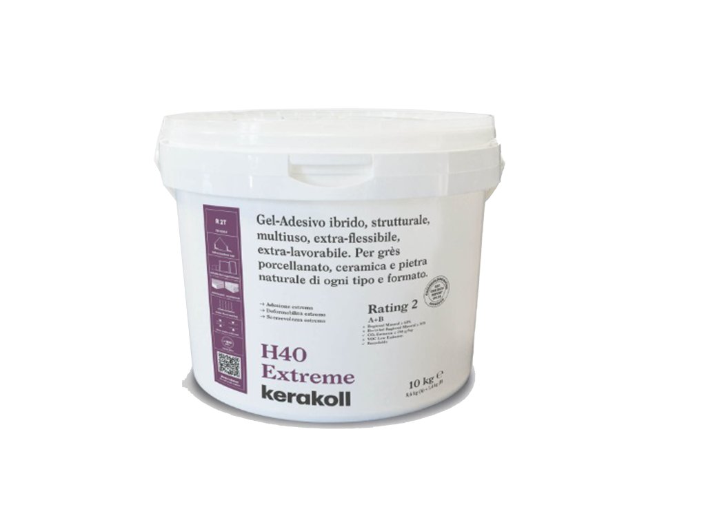 Kerakoll H40 Extreme je nejvyšší třída lepidel H40 – hybridní, strukturální, extra flexibilní a vysoce zpracovatelné gelové lepidlo pro profesionální projekty s extrémními nároky. Vyniká extrémní přilnavostí, extrémní elasticitou a mimořádnou kompatibilitou s téměř všemi stavebními materiály, včetně těch problematických (PVC, LVT, kov, epoxidové vrstvy, gumové povrchy).