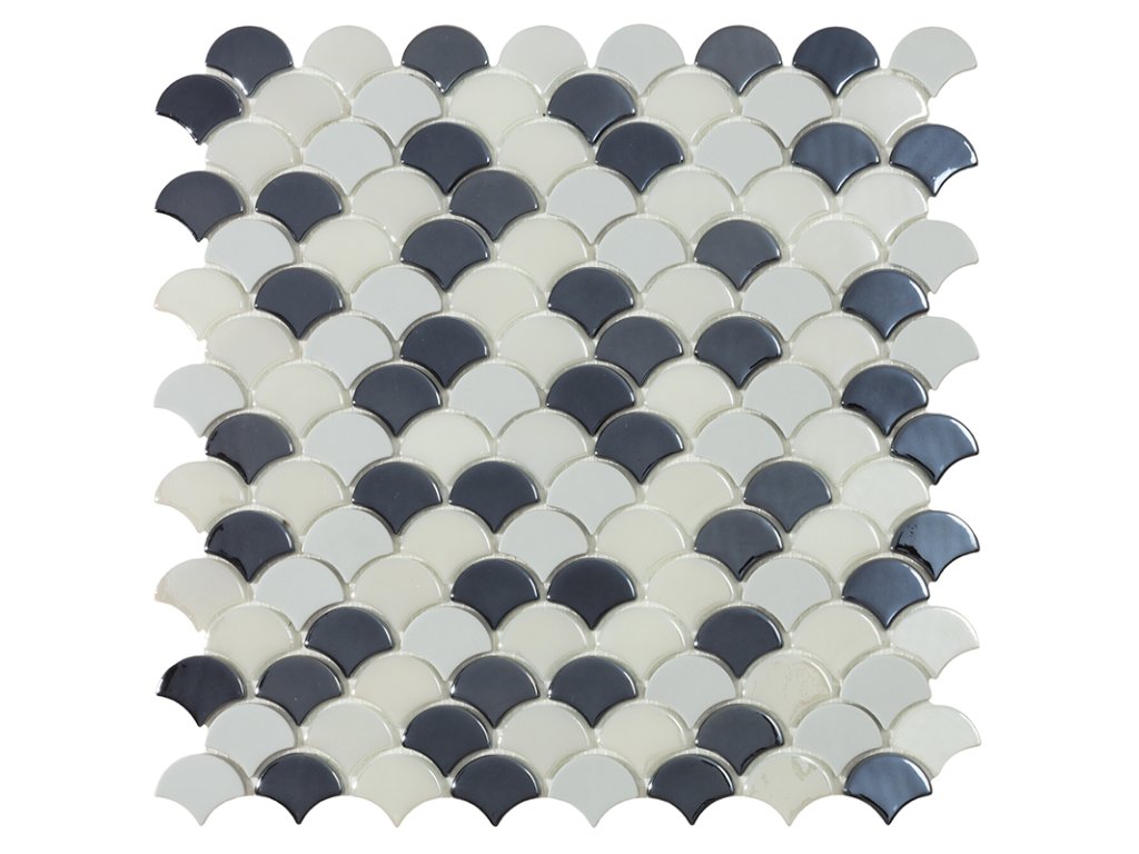 Skleněná mozaika černá; šedá; bílá FTSOULBKM se smíšeným povrchem a ve tvaru rybích šupin jednotlivých prvků mozaiky.