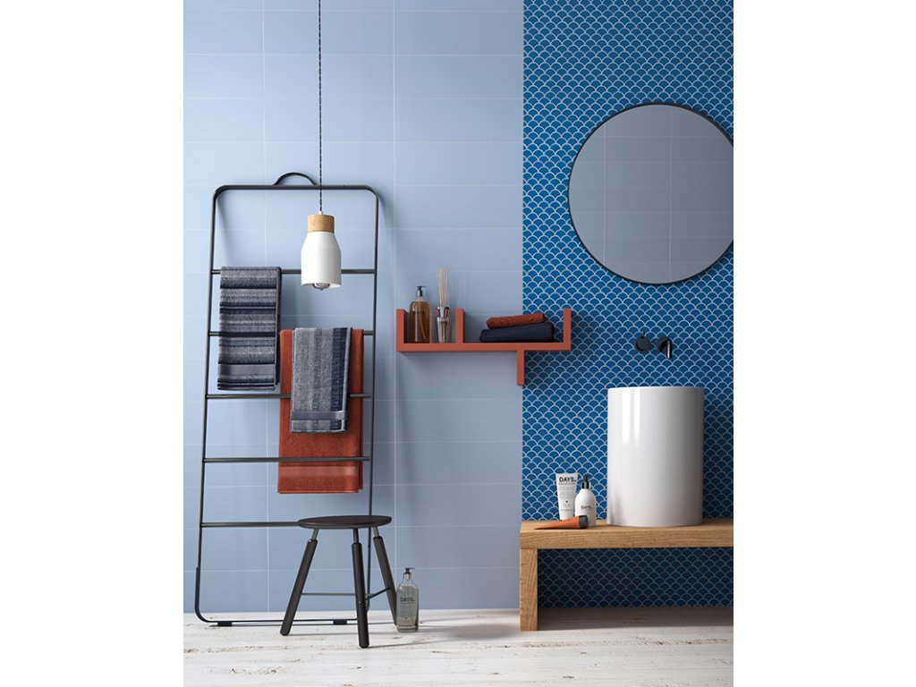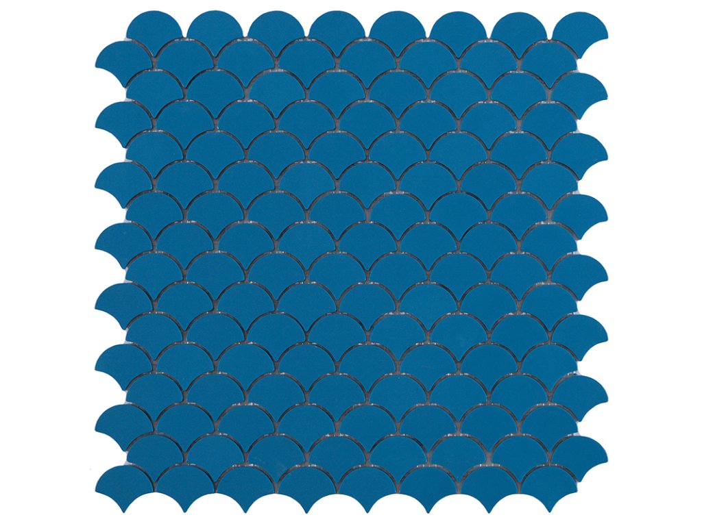 Skleněná mozaika modrá FTSOU6104 s matným povrchem a ve tvaru rybích šupin jednotlivých prvků mozaiky.
