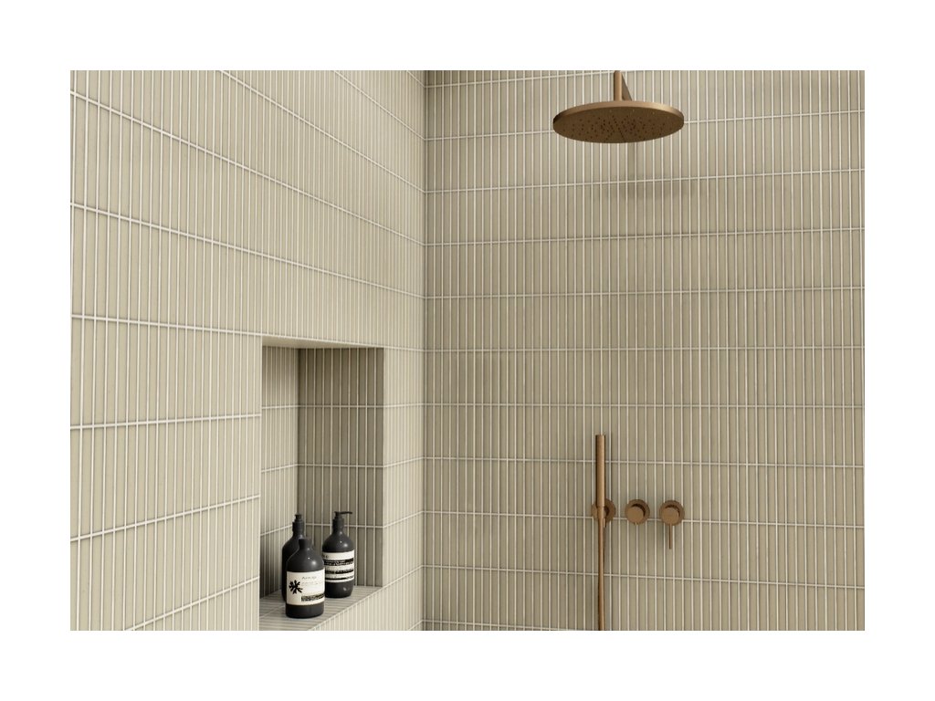Spára této mozaiky je 3.5 mm a velikost dílků mozaiky je 2x14,5 cm. Plata pro montáž mají rozměr 29,6x29,9 cm a tloušťka obkladu je 8 mm.
