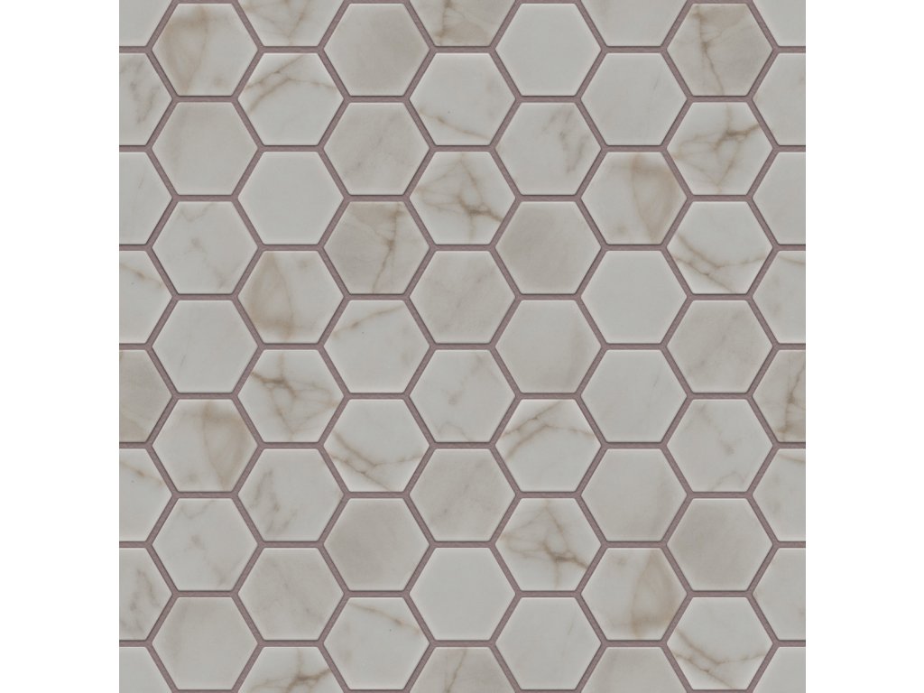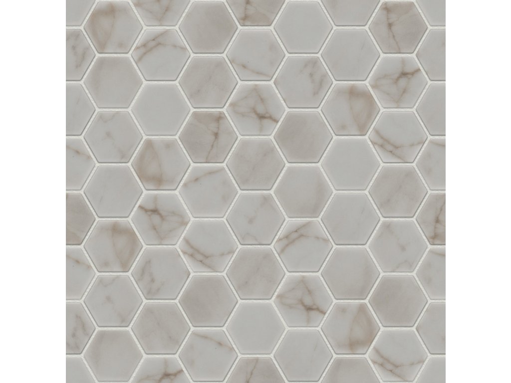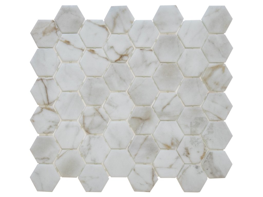 Bílá skleněná mozaika VAL10M v elegantním hexagonovém tvaru přináší jemnou imitaci bílého mramoru s přírodním béžovým žíháním. Matný povrch podtrhuje její nadčasový a harmonický vzhled, který se skvěle hodí do moderních i klasických interiérů.