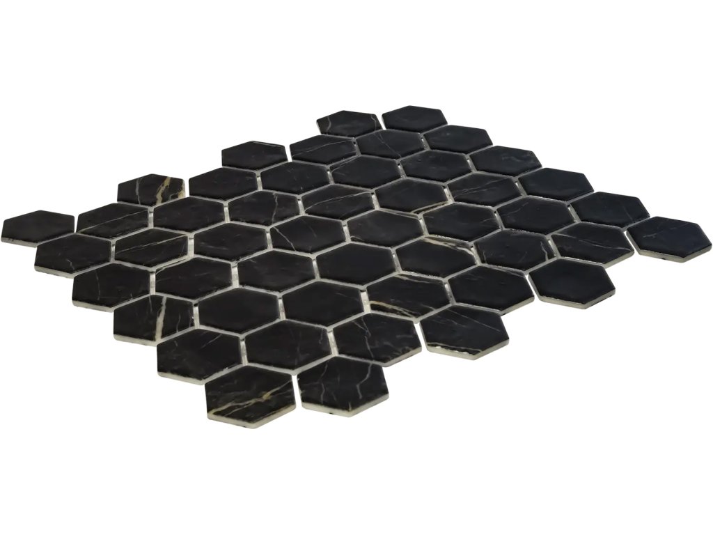 Černá skleněná mozaika VAL95M s dekorem černého mramoru, matným povrchem a šestiúhelníkovým tvarem.