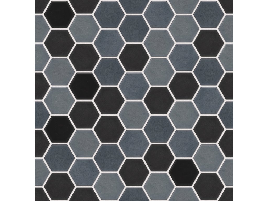 Skleněná mozaika VAL920 v luxusním hexagonovém tvaru přináší výrazný mix dvou odstínů černé – hluboké, syté černé a černé s jemným perleťovým efektem. Právě perleť dodává mozaice jedinečný a proměnlivý vzhled, který se mění v závislosti na úhlu dopadu světla. Obklad tak působí živě, moderně a dodá interiéru výrazný dekorativní prvek.